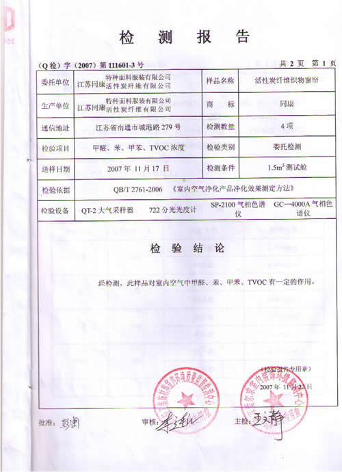 活性炭纖維織物窗簾檢測報(bào)告