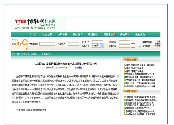 中國棉紡織信息網(wǎng)、中國聚合物網(wǎng)——江蘇同康:最新研制的活性碳纖維產(chǎn)品獲得第22個(gè)國家專利