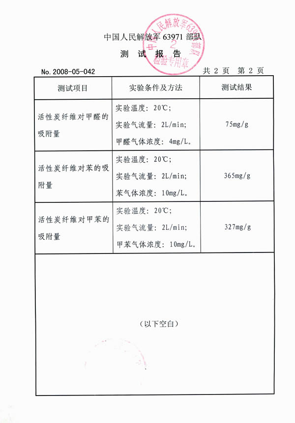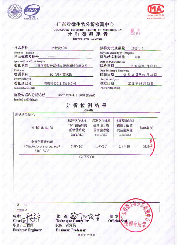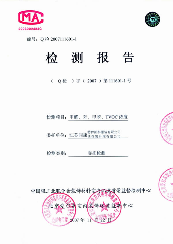 江蘇同康特種活性炭纖維公司生產的活性炭纖維居室凈味寶、汽車凈味寶獲得國家專利,特別適用于新裝居室、汽車或及新置家具里各種有害物質,尤其是致癌物質、芳香族類的化合物(如苯類、醛類)的去除,使空氣潔凈清新,有利人體身心健康。該產品經中國室內裝飾協會環境監測中心檢測對甲醛、苯、甲苯、有機揮發物(TVOC)的消除有明顯作用。